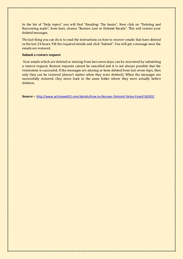 But like any other email pages, yahoo! Even basic knowledge of how the internet works will go a long way towards. When you delete an email in gmail inbox, it goes to the trash folder instead of being deleted straight away. This article will show you the easiest steps to help you with the yahoo mail restoration. If you're not able to find a deleted email in your trash folder, you can submit a restore request to yahoo. Everything that ends up in the deleted items and junk email folders is recoverable for 30 days. Find out how to submit a restore request. Whenever an email is deleted from its folder it is automatically transferred to a trash folder. Complete the required form and hit submit. If you want to recover the yahoo emails deleted recently, locate the left navigation bar and go to the trash folder. How does yahoo email get deleted from your system? But occasionally our important emails get deleted by mistake and this can cause serious problems. Yahoo mail is one of the biggest email services currently.